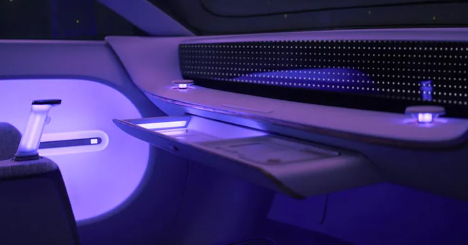 다가오는 자율주행 시대를 위해 설계된 접이식 컨트롤 스틱도 중요한 포인트입니다. 스티어링휠이 사라지면서 대시보드가 매우 슬림해졌고 운전석 쪽의 공간 활용도가 더욱 높아진 덕분에 시트 배열도 더욱 자유로울 수 있었습니다. 아이오닉7이 2024년 양산될 때에 현대자동차의 자율주행 기술이 완성이 되었다면 실제로도 충분히 적용 가능한 부분이라고 생각됩니다.